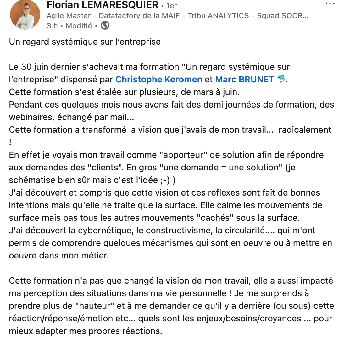 Ancrer la posture réflexive systémique comme une compétence durable et élaborer un plan de développement personnel pour continuer à intégrer l'approche systémique.